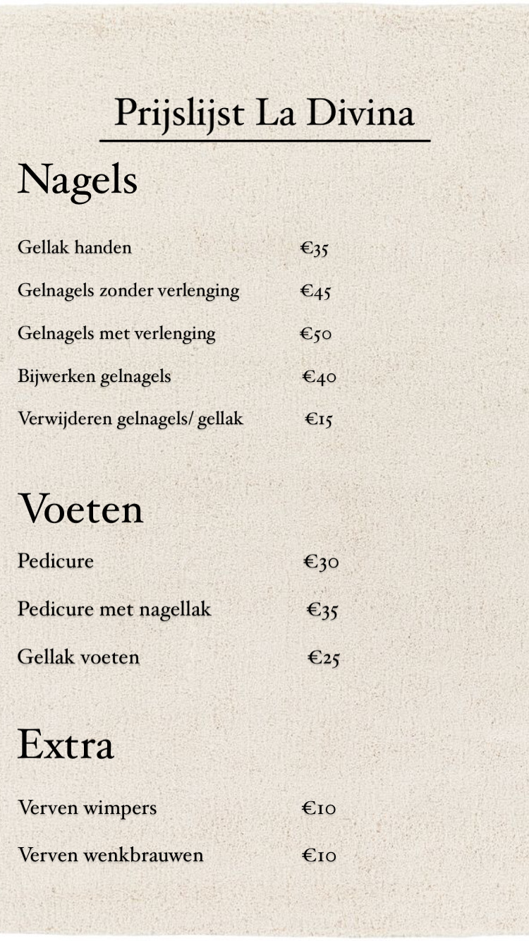 Bij La Divina kan je onder meer terecht voor: Gelnagels, gellak, wimperextentions, lashlift, pedicures en ontharingen. Doordat ik regelmatig opleidingen volg wil ik jullie telkens de laatste trends kunnen aanbieden. Voor meer foto's en informatie ga een kijkje nemen op mijn social media pagina's: Facebook en/of Instagram.